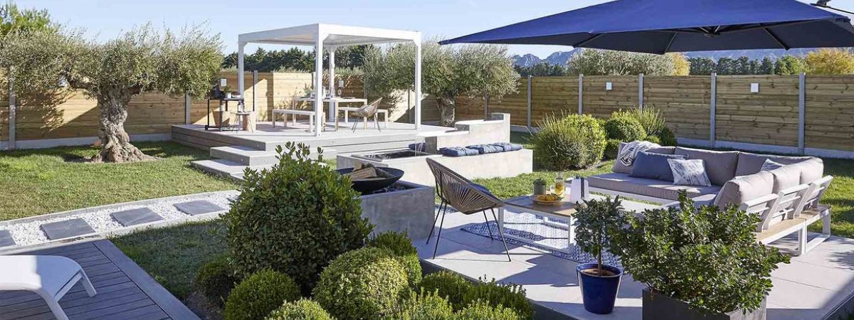 To live outside and take full advantage of the garden, it is enough to arrange it in the manner of a huge living room. We distribute the different functions, eating, receiving, resting, cooling off, etc., on terraces linked by a graphic path. For meals, head to the large table sheltered under a bioclimatic pergola. The outdoor living room, with a sofa and coffee table, takes shelter under an XXL parasol. Between the two spaces, it is the Zen corner where one settles on either side of a central fountain. We unify everything by choosing common light colors, from white to gray. With these different graphic layouts, you get a large, modern, and mineral Zen garden.