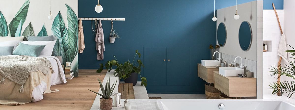 To create a comfortable and bright Natural Parental Suite or master bedroom, we forget the partitions! Bedroom and bathroom are installed in a totally open space, punctuated by a difference in level. On the platform side, the sleeping area, with an original headboard which gives character to the room while masking the dressing room behind. Below, there are two independent washbasins, a spa bath and a large walk-in shower lit by an overhead opening. The style, fresh and natural, mixes wood, waxed concrete, intense blue, white, soft green and many plants.