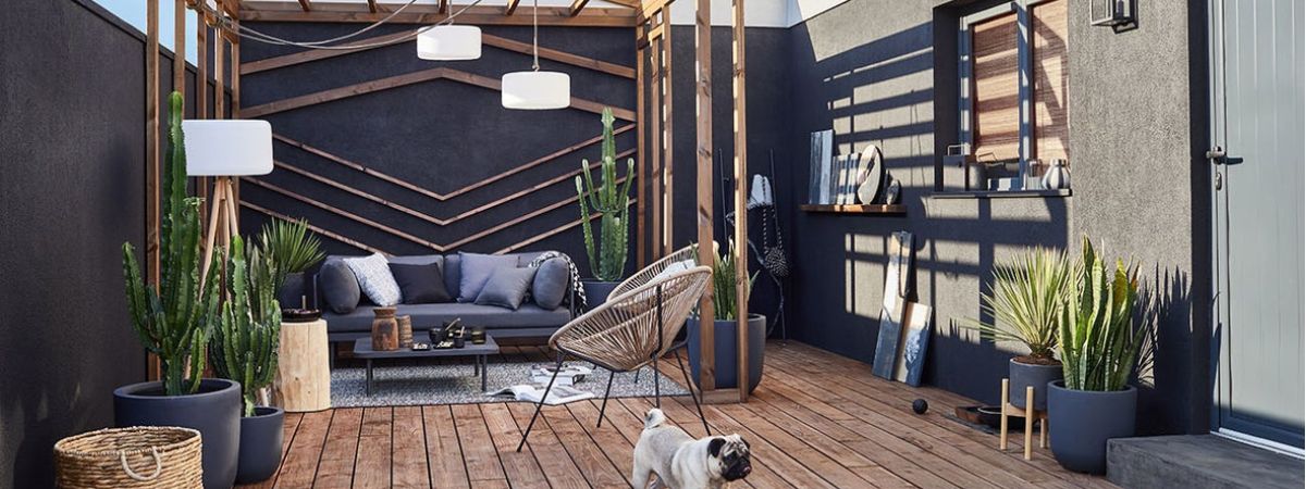 When you are a fan of decoration, why not reproduce the elegance, design, and comfort of your living room outside? To implement this attractive idea, head for the outdoor courtyard: the walls are painted in matt black for an elegant setting, a custom and design pergola symbolizes the volume of a “real” room and a soft outdoor sofa invites you to relax. We add lights and graphic plants and we put the whole on a dark wooden terrace: life inside and out, the sky more!