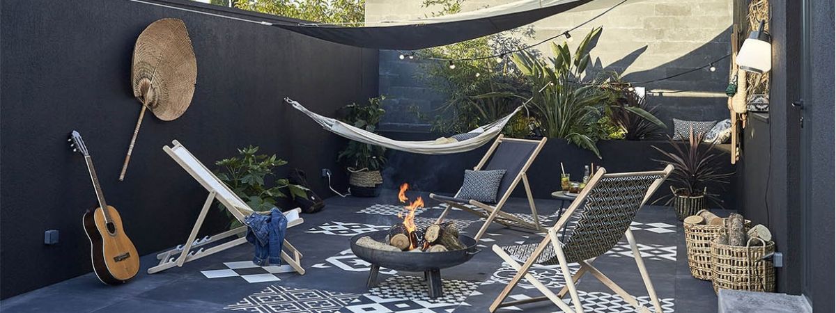 It is possible to give style to your outdoor courtyard while making it comfortable and welcoming. We first choose black as the background color to create an elegant space. We then favor folding furniture and accessories, to arrange the courtyard as it pleases in a bohemian spirit. The only strong element is the floor: the imitation cement tiles with XXL patterns give character and character, in harmony with the deckchair fabrics and cushions with graphic patterns. Finally, by adding vegetal touches, we obtain a friendly and versatile living space.