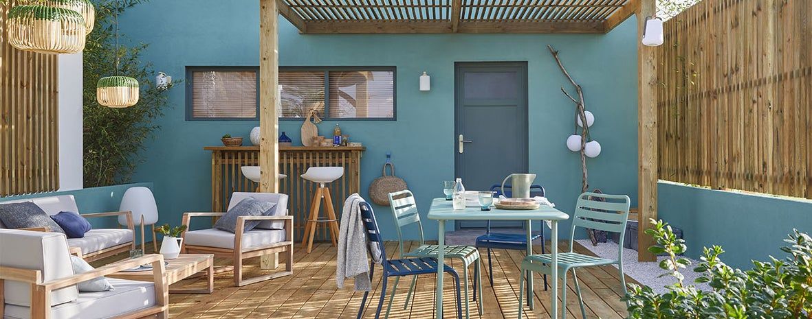 When you are a fan of decoration, why not reproduce the elegance, design, and comfort of your living room outside? To implement this attractive idea, head for the outdoor courtyard: the walls are painted in matt black for an elegant setting, a custom and design pergola symbolizes the volume of a “real” room and a soft outdoor sofa invites you to relax. We add lights and graphic plants and we put the whole on a dark wooden terrace: life inside and out, the sky more!