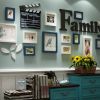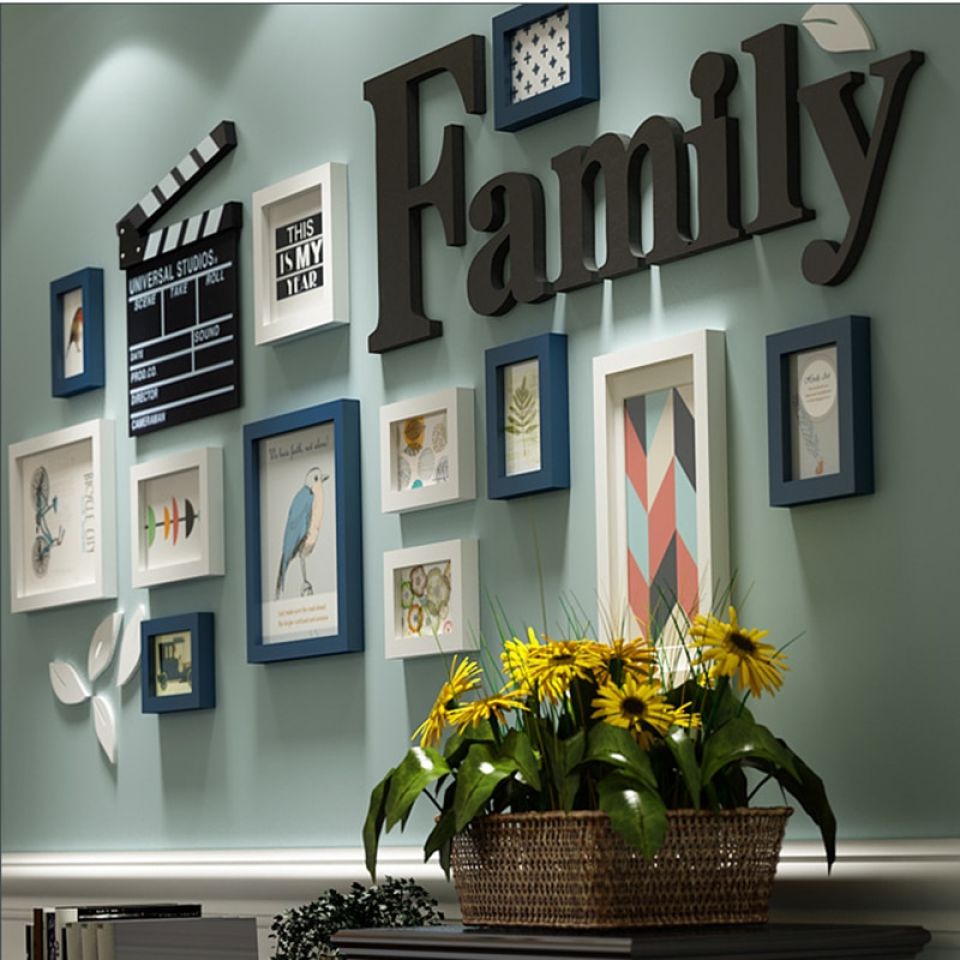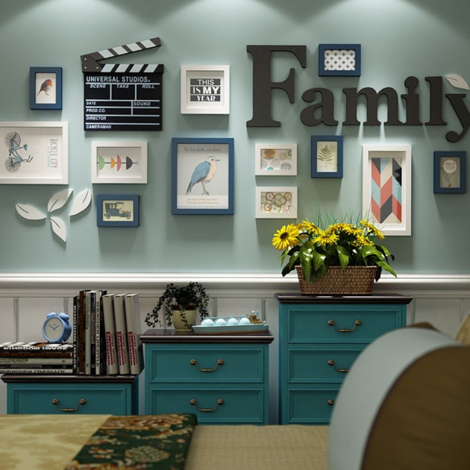 - It includes multiple photo frames in a variety of different sizes and orientations along with other wall hangings.