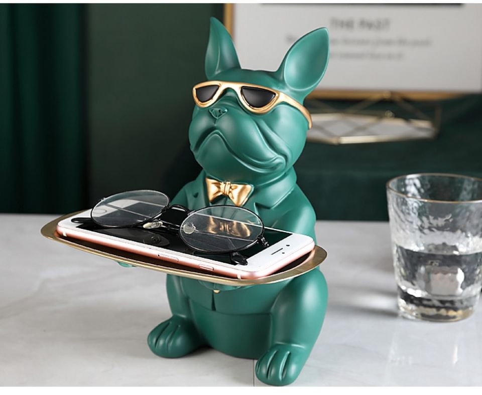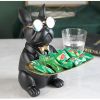 - This functional decor piece features a modern bulldog sculpture in a tux holding a tray.