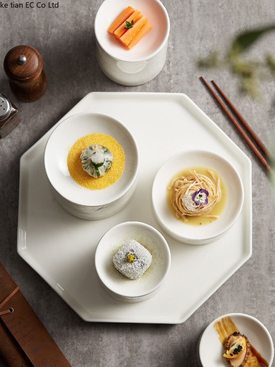 Enhance your dining experience with our Ceramic White Platter and Small Bowl Snack cold dish tableware set. Perfect for sushi and snacks, this Japanese-inspired tableware adds a sophisticated touch to any meal. Ideal for home or restaurant use.
