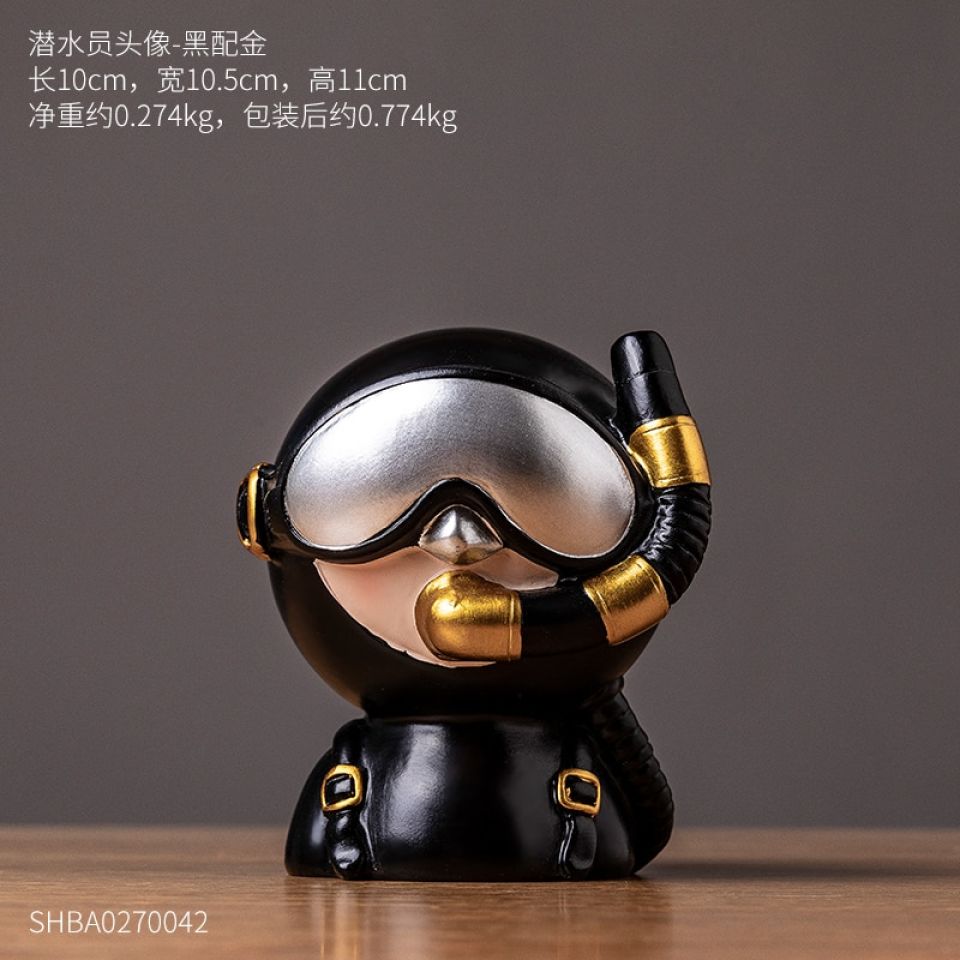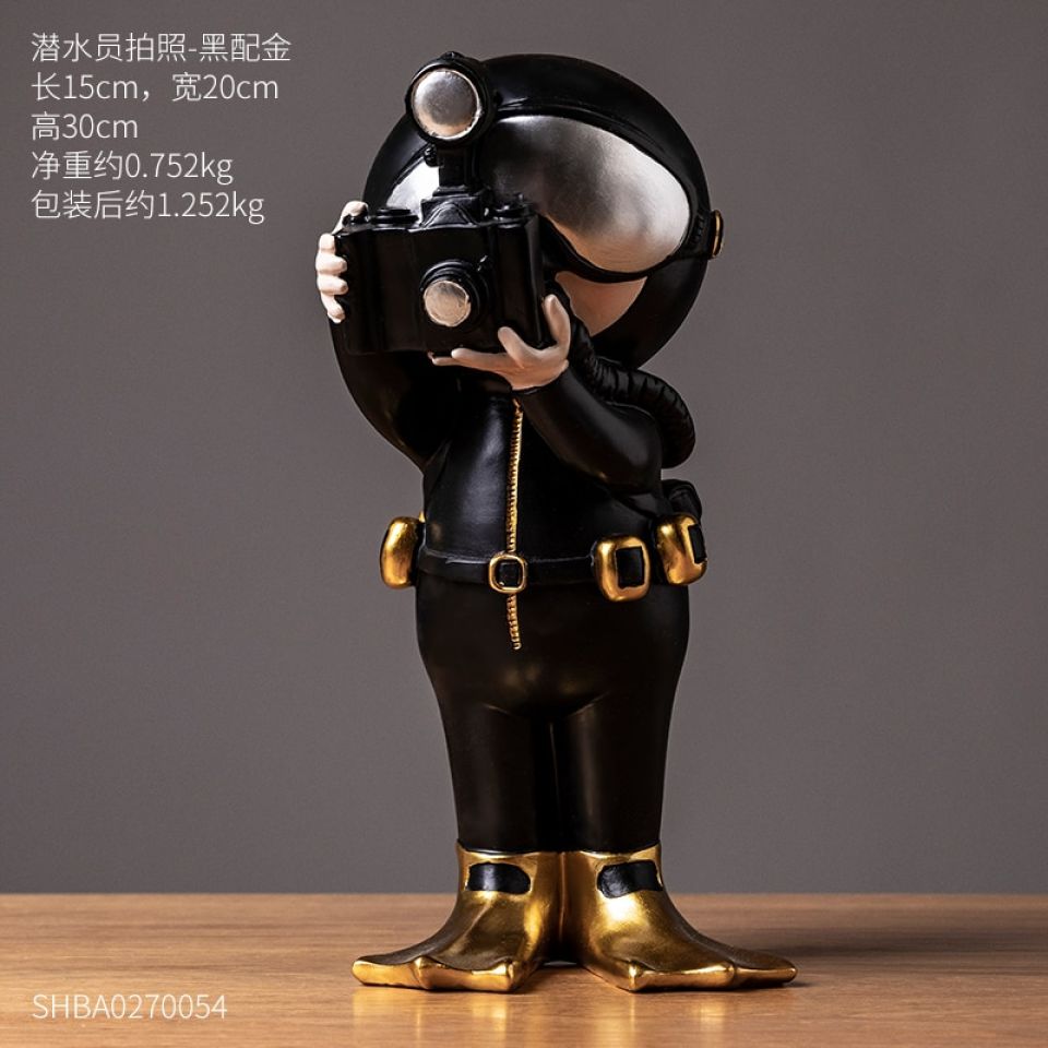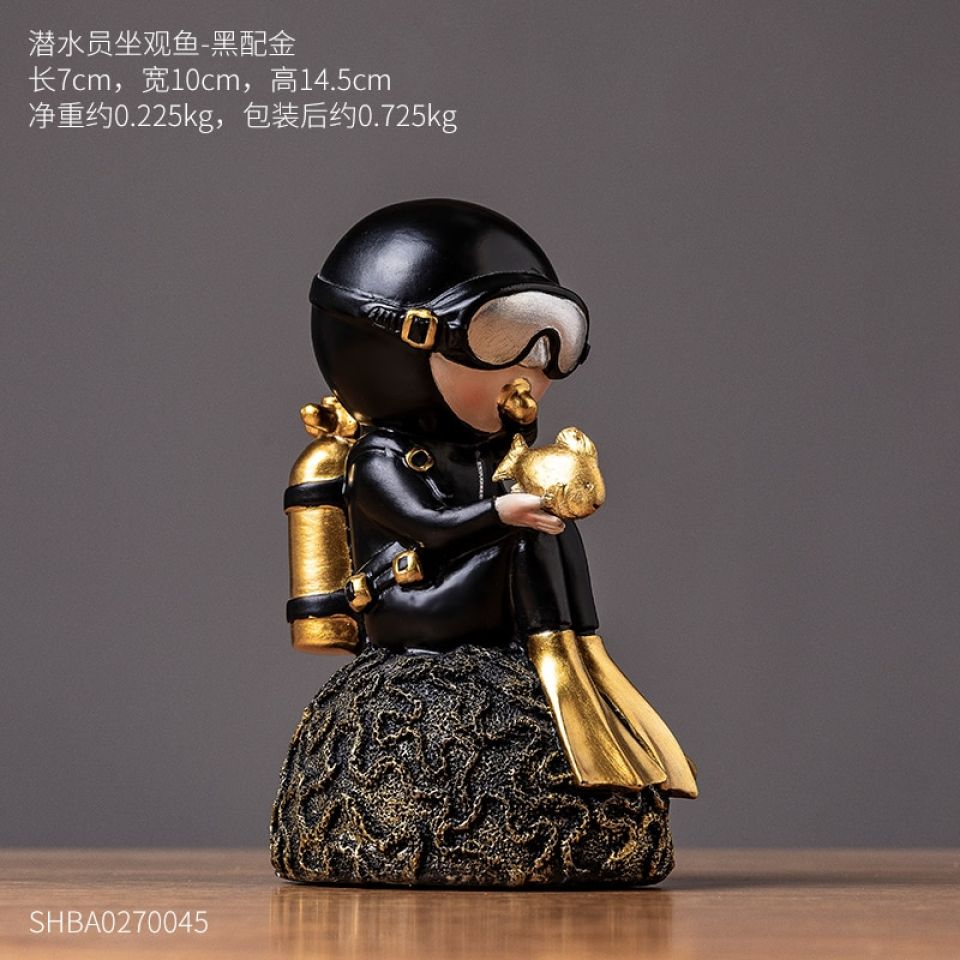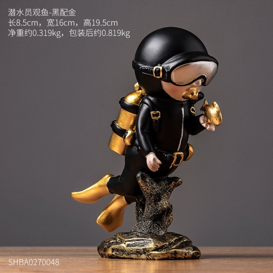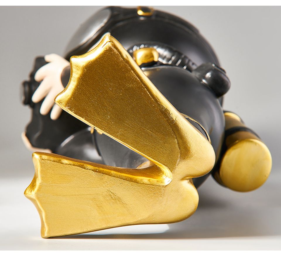 - The design features figurines of divers in a black suit with shiny gold accents.
