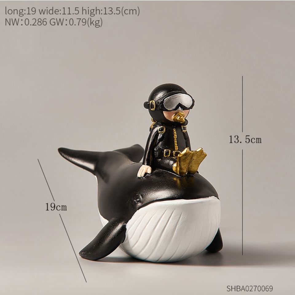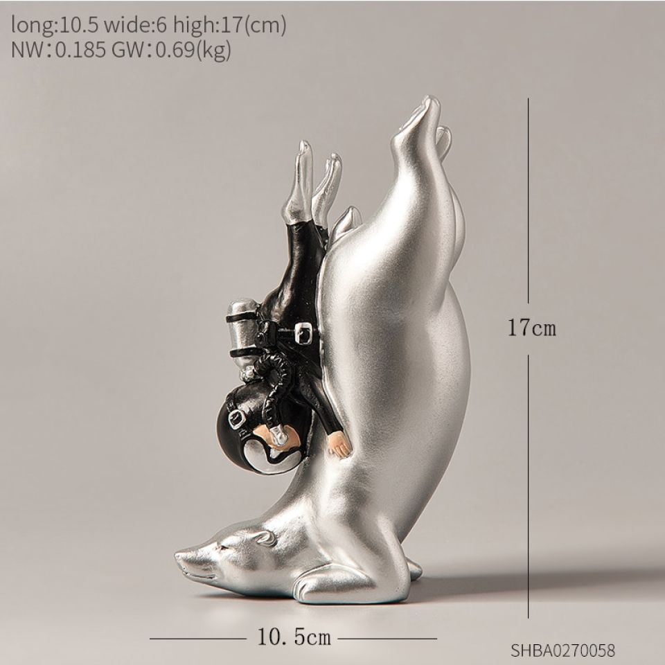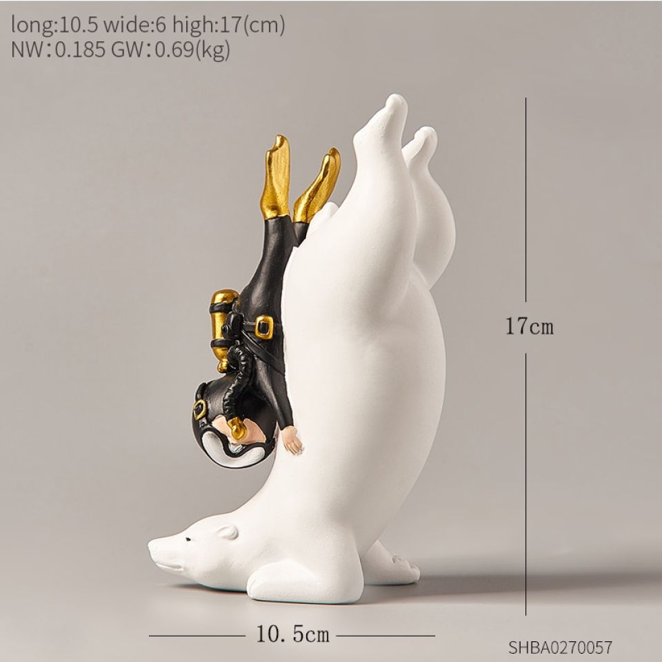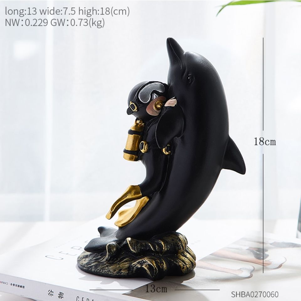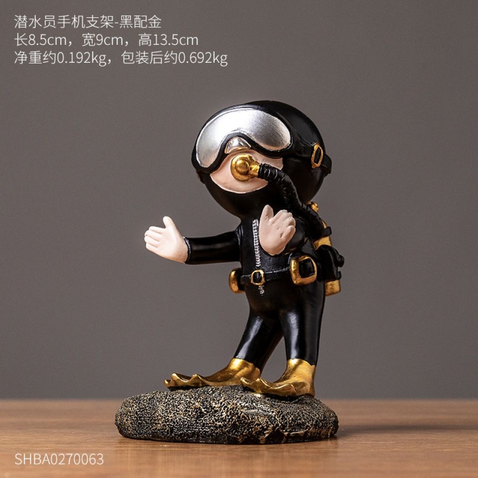 - The design features figurines of divers in a black suit with shiny gold accents.