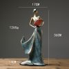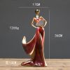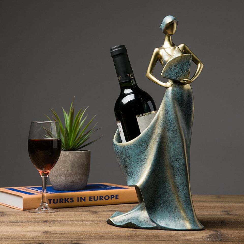 - The sculpture showcases a lively woman in a flowy evening gown that forms the base for holding wine bottles.