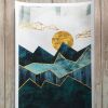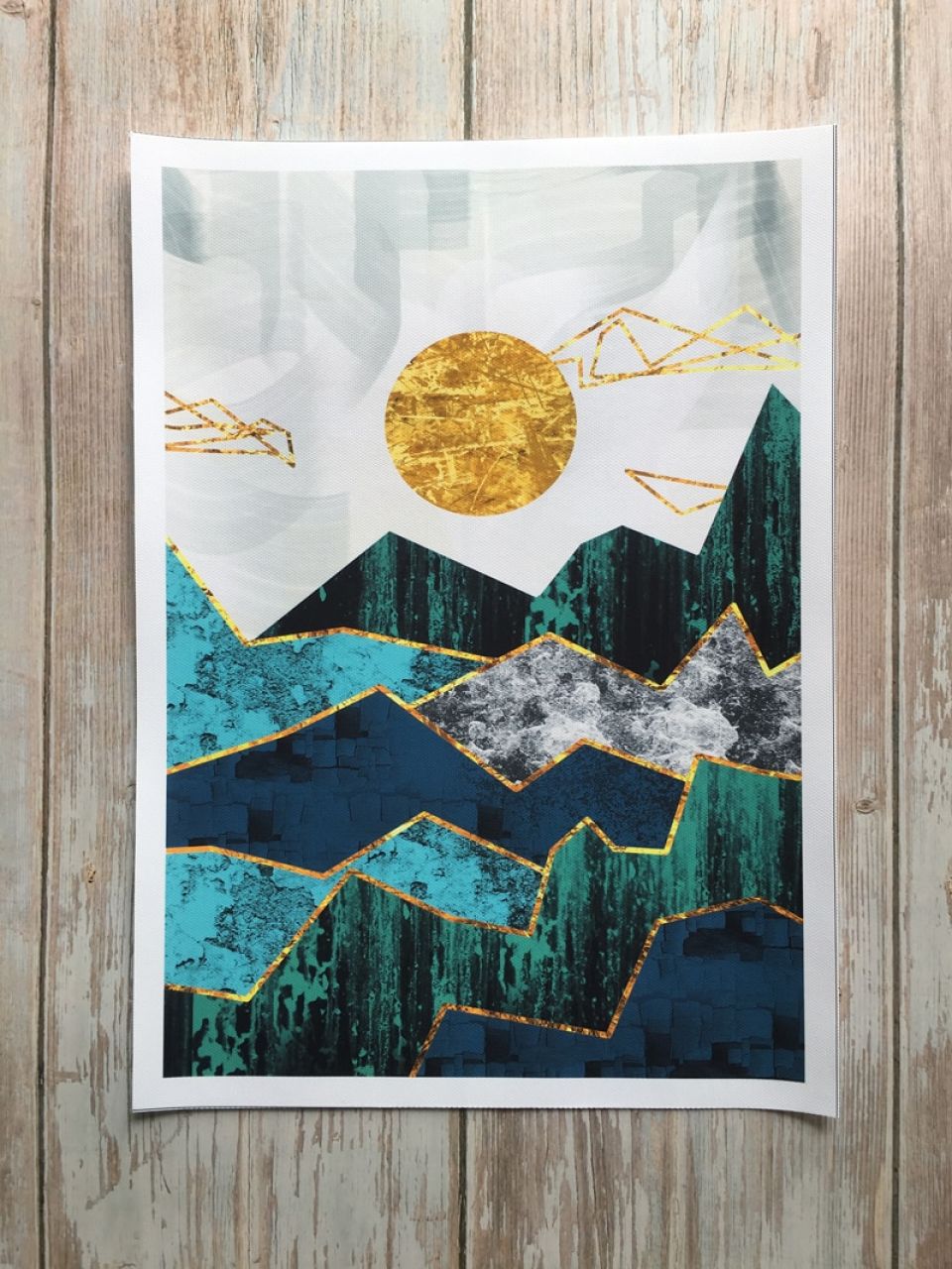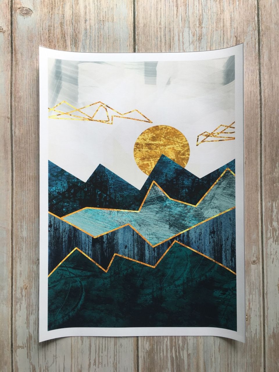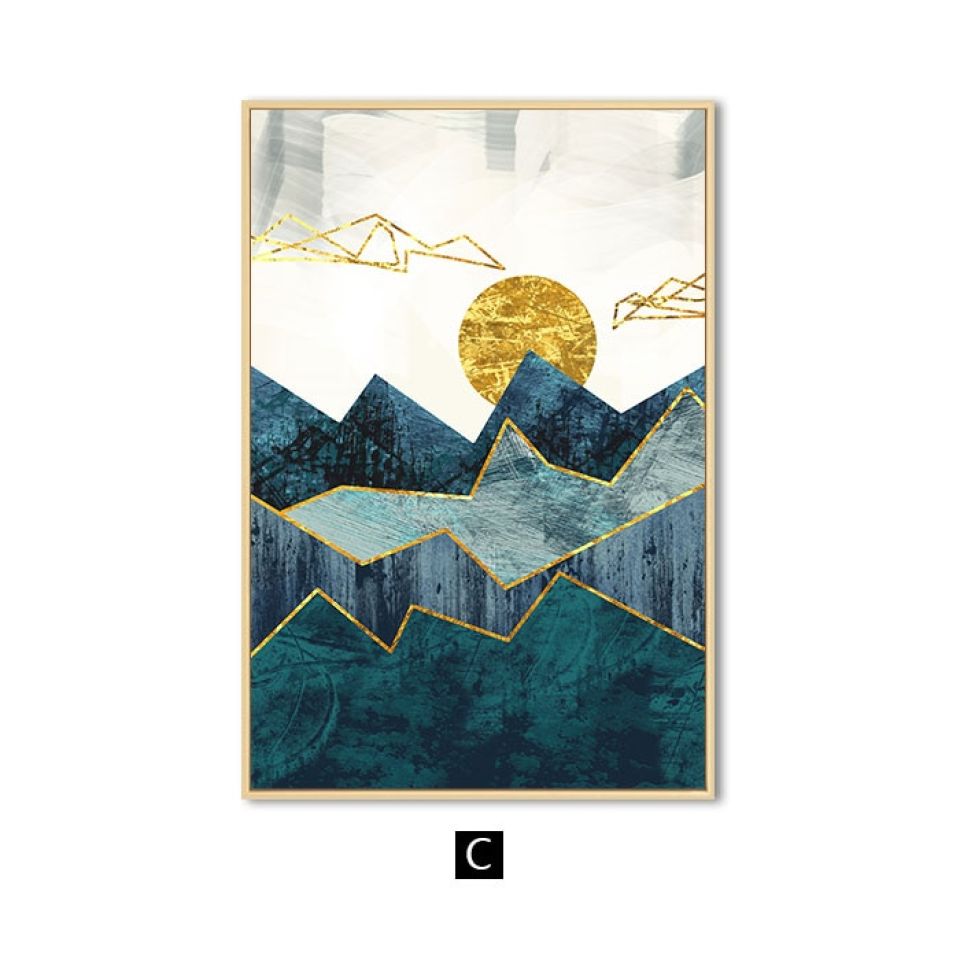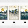 - The paintings are filled with vibrant shades showcasing a landscape of a sunset in the mountains.