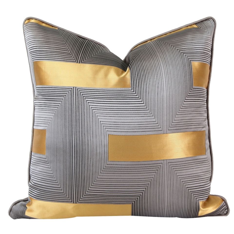 It is a classic square throw-on with black and white stripes. The stripes are interrupted with golden patches of fabric. This gives a shine and dimension to the dull design. The golden color adds life to the plain cover.