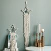 The wall hanging is handmade with think cotton threads. The woven laces are strung together by a common ring.