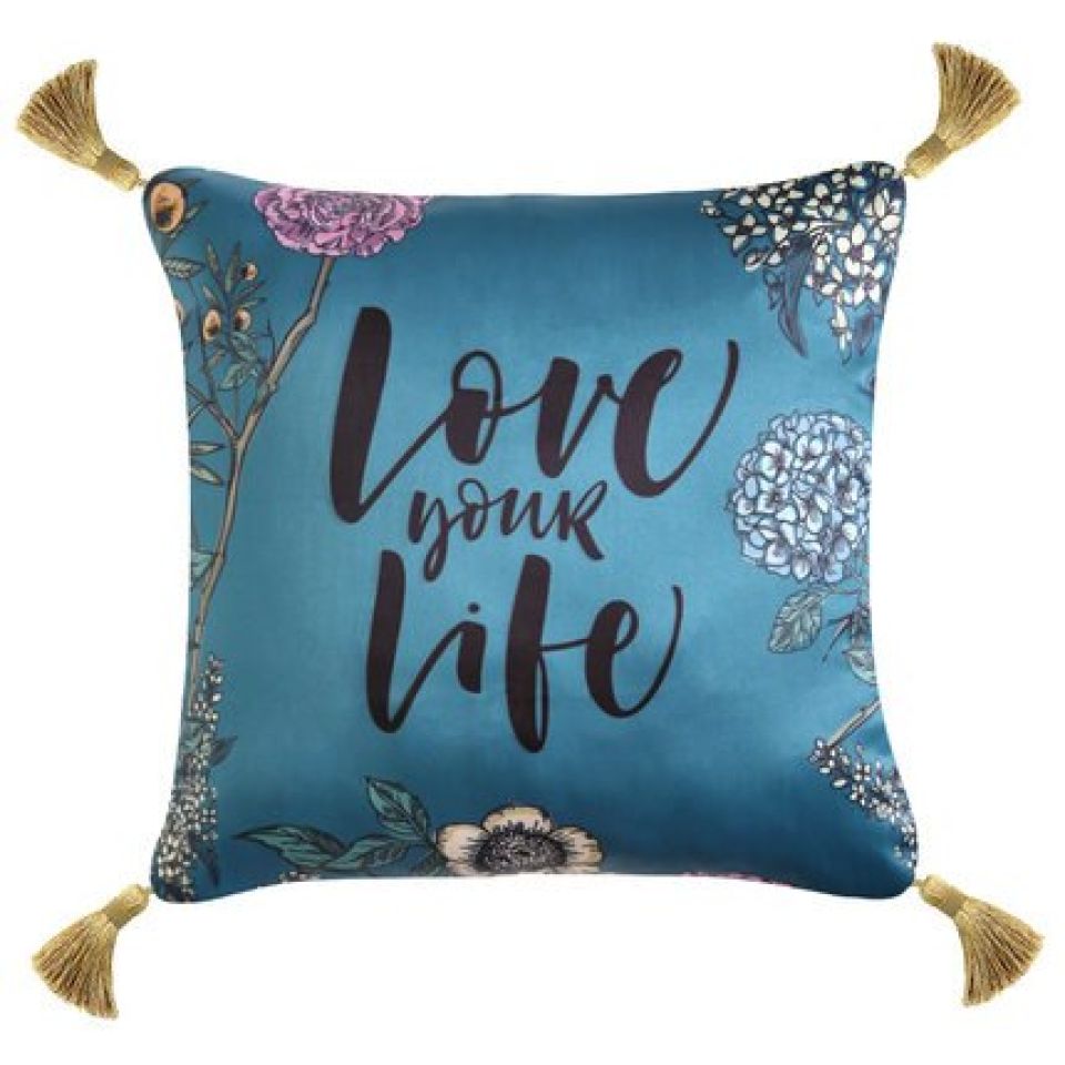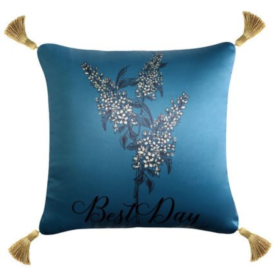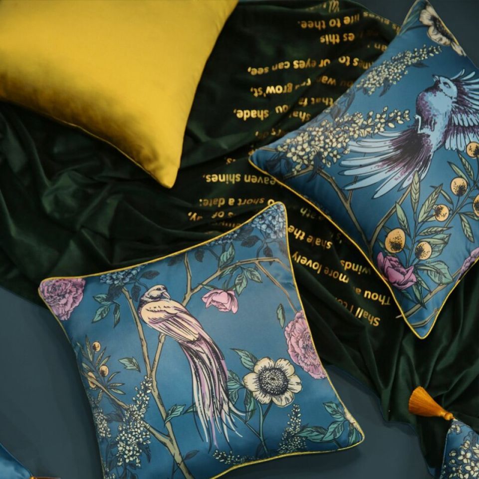The peacock blue is indeed a rich color. The bird pattern embroidery is a stunning addition to the color. It complements the cover well. The detail of the quotes looks like a quirky effect.