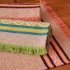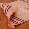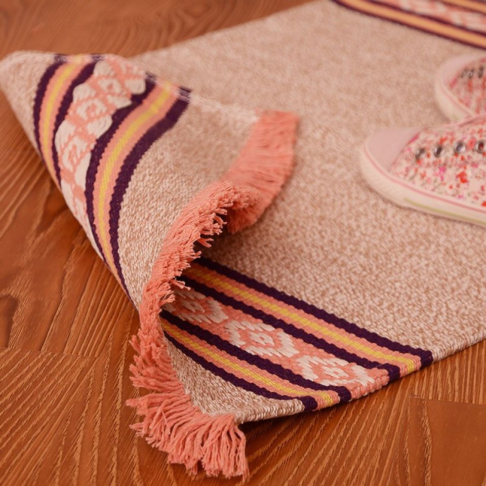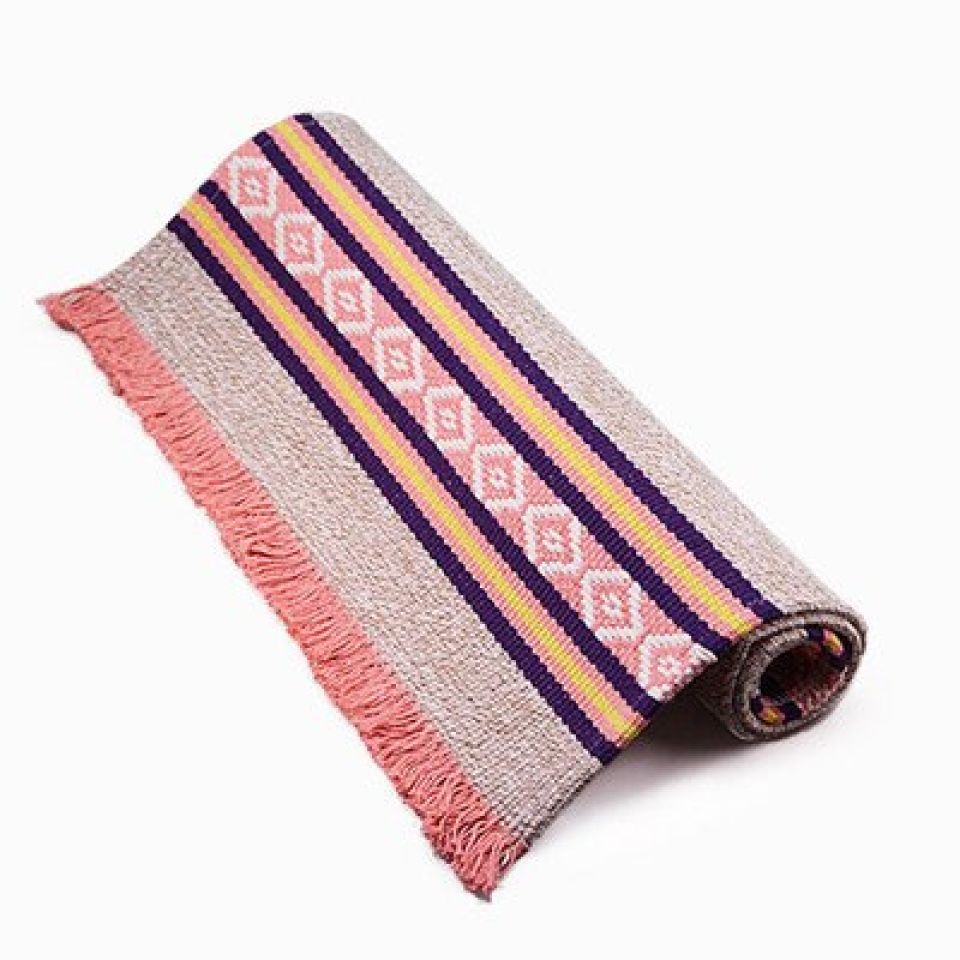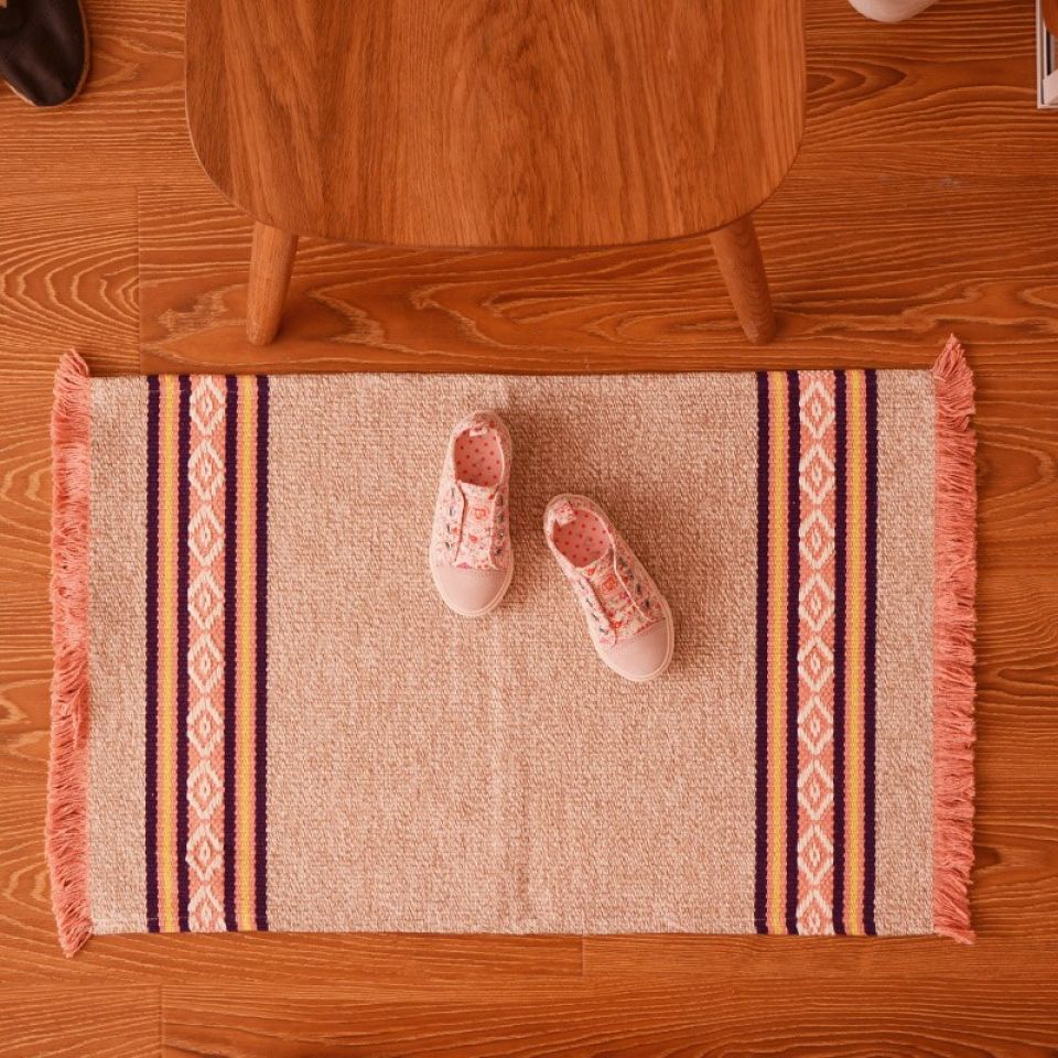The mat is a typical rectangle with short tassels on the breadths. The woven design on the shorter lengths gives the mat a dimension and pattern.