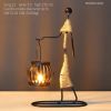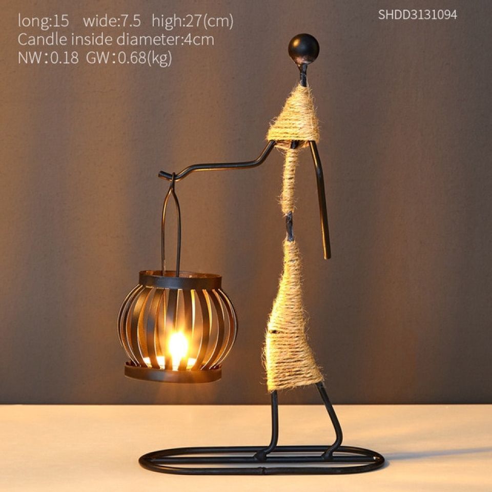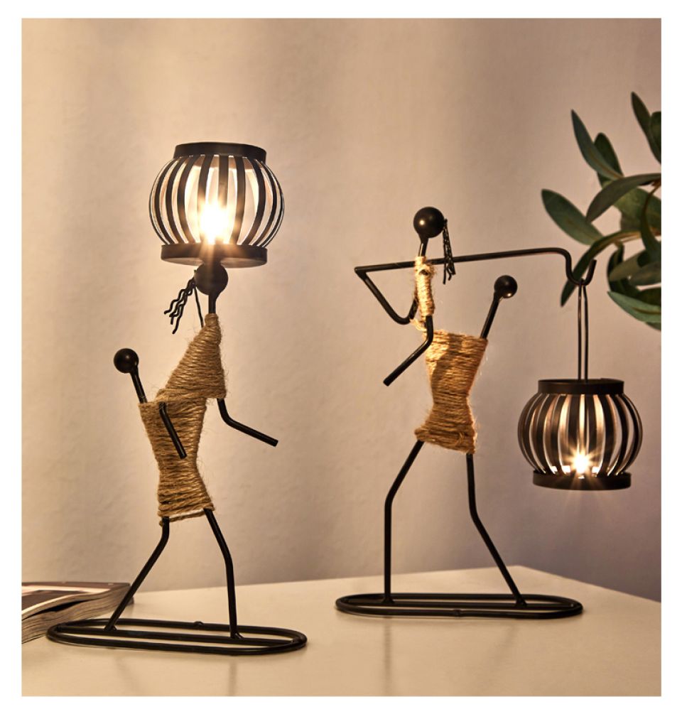 - It features stick figures in tribal attire made of hemp rope holding lamps with slits in which the candles are placed.