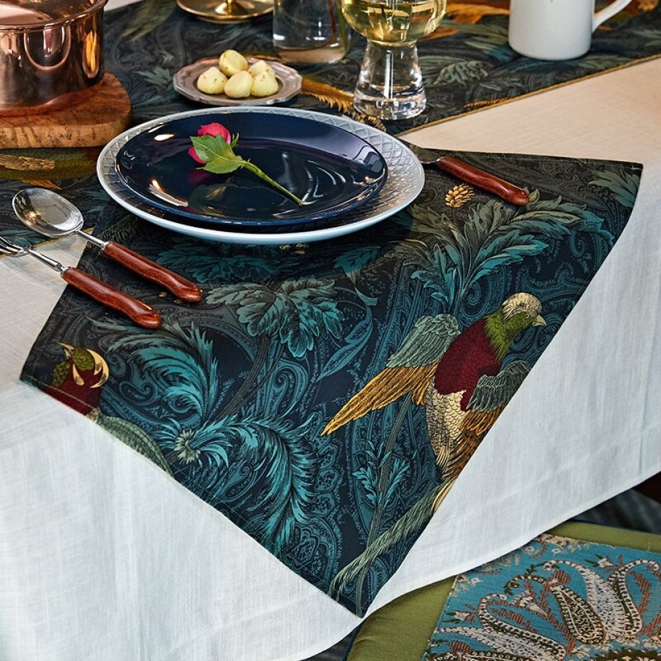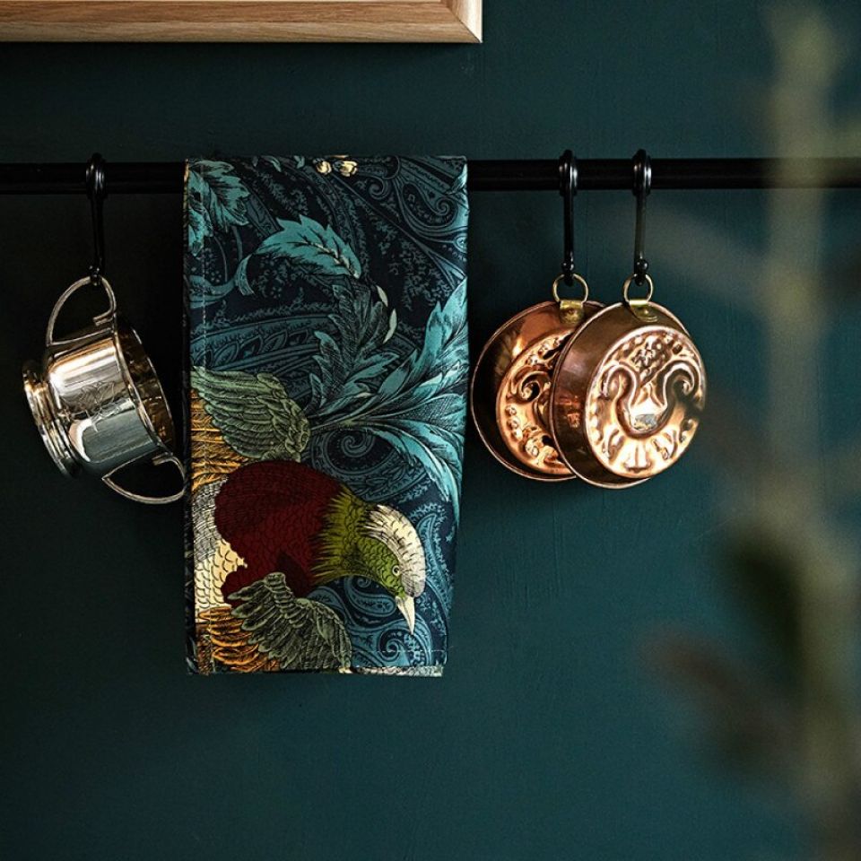 The cool tones teal and blues from the base of the leafy design. The nightingale print has details of mustard and maroon feathers.