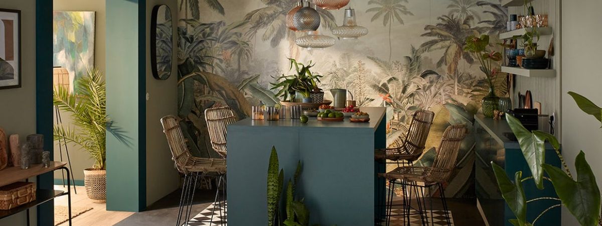 Do you want exoticism, abundance and a warm atmosphere? We have the solution! By mixing maximalism and tropical inspirations, you can radically transform the atmosphere of a room, like the dining room here. The centerpiece, the fresco wallpaper that sets the tone and invites you to travel. This life-size decor is contrasted with graphic flooring to form an original decorative duo. In this visually strong universe, we favor for the high table and the DIY dresser clean lines and an intense and chic blue-green shade. Accumulations of glass lights, accessories made of natural materials and plants do the rest.